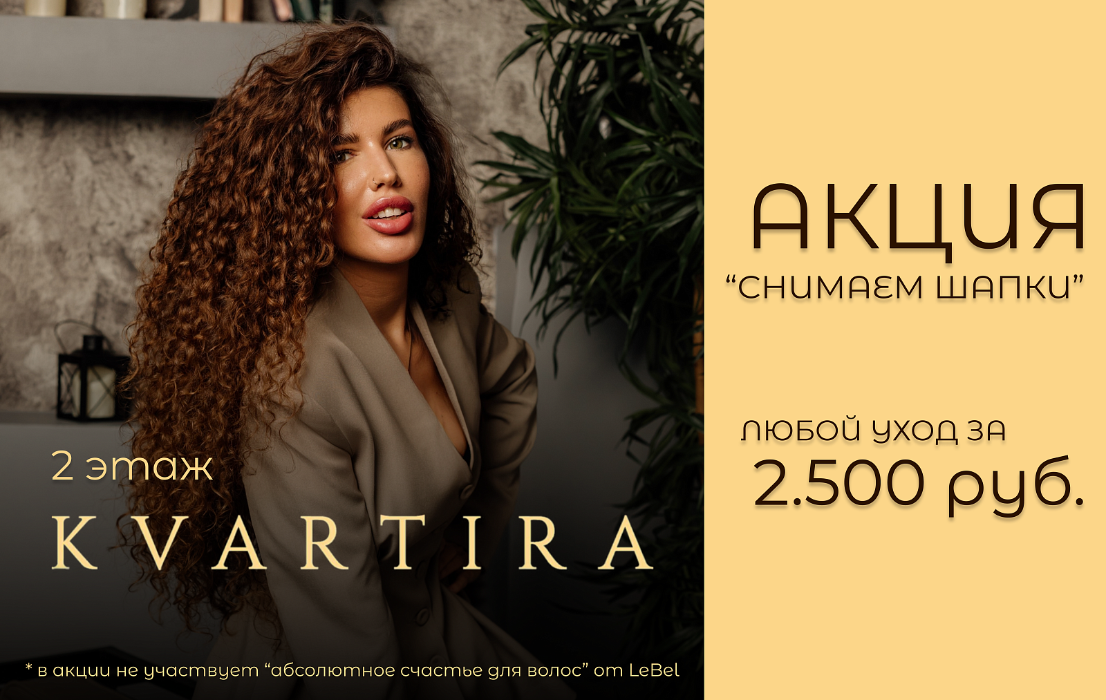 Запишитесь на процедуру в рамках акции "Снимаем шапки" и позвольте своим локонам засиять! Специальная цена 2500 рублей действует ограниченное время, не упустите шанс!